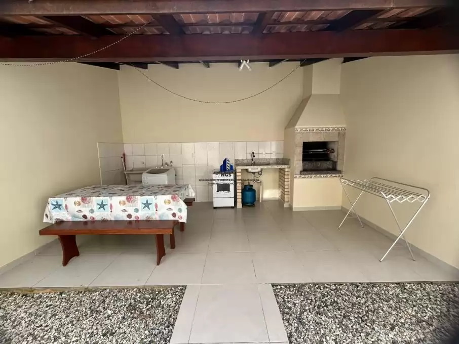 Área de churrasqueira, com mesa e bancos de madeira